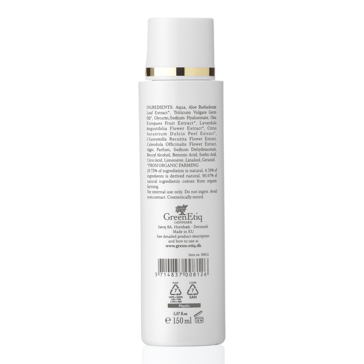 De fine råvarer såsom Økologisk aloe vera, Økologisk Lavendel, Økologisk Sød Appelsin samt naturlig Kamille, både renser, opstrammer, modvirker rødme samt beroligerer huden.