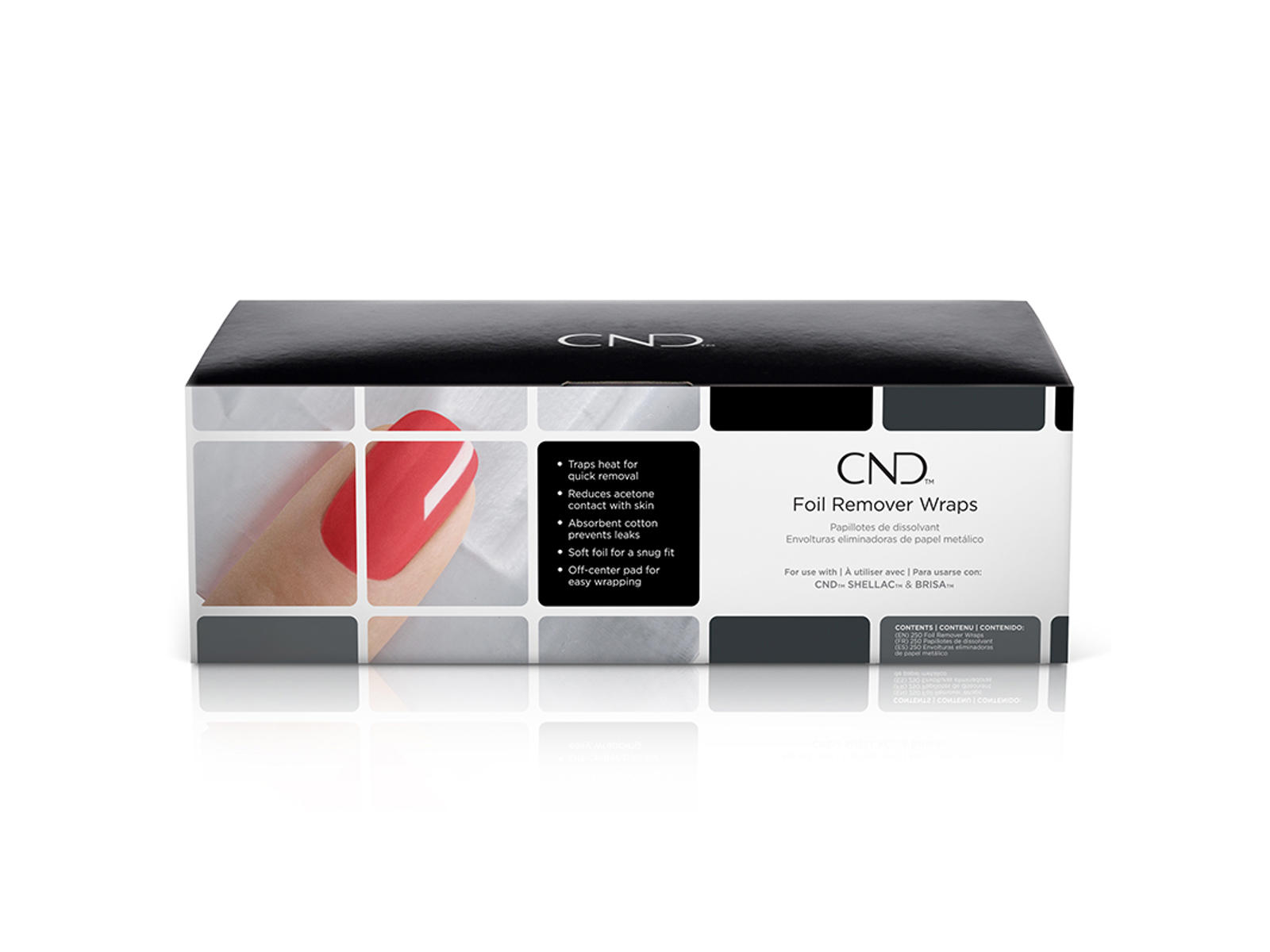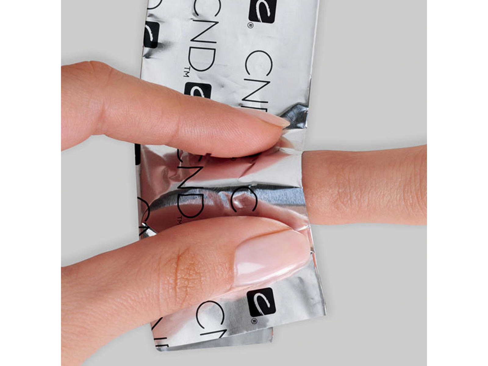 Patenterede Foil Remover Wraps™, som bruges til at opløse SHELLAC® på en ren, praktisk og nem måde. Indpakningerne er designet til at passe rundt om en finger og sikrer, at de sidder til og ikke falder af. Der er indbygget et vatstykke i indpakningen, som skal vædes med CND Nourising RemoverTM, der efterfølgende sikrer at SHELLAC® bliver opløst skånsomt og ikke kommer i kontakt med huden. Når Nourishing Removeren™ har været i forbindelse med SHELLAC® i den anbefalede aftagningstid, fjernes Remover Wraps'ne ved at man tager fat med tommelfinger og pegefinger omkring indpakningen, og med et lille twist løsnes SHELLAC® fra neglen, så det nemt tages af. Skulle der sidde enkelte rester af SHELLAC® på neglen, så sæt Remower Wraps på neglen et par minutter mere, så resten bliver aftaget. Afslut med at aftørre neglen med CND Nourising Remover™ med en nail wipe.