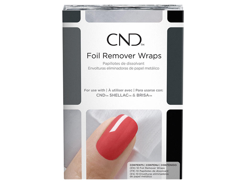 Patenterede Foil Remover Wraps™, som bruges til at opløse SHELLAC® på en ren, praktisk og nem måde. Indpakningerne er designet til at passe rundt om en finger og sikrer, at de sidder til og ikke falder af. Der er indbygget et vatstykke i indpakningen, som skal vædes med CND Nourising RemoverTM, der efterfølgende sikrer at SHELLAC® bliver opløst skånsomt og ikke kommer i kontakt med huden. Når Nourishing Removeren™ har været i forbindelse med SHELLAC® i den anbefalede aftagningstid, fjernes Remover Wraps'ne ved at man tager fat med tommelfinger og pegefinger omkring indpakningen, og med et lille twist løsnes SHELLAC® fra neglen, så det nemt tages af. Skulle der sidde enkelte rester af SHELLAC® på neglen, så sæt Remower Wraps på neglen et par minutter mere, så resten bliver aftaget. Afslut med at aftørre neglen med CND Nourising Remover™ med en nail wipe.
